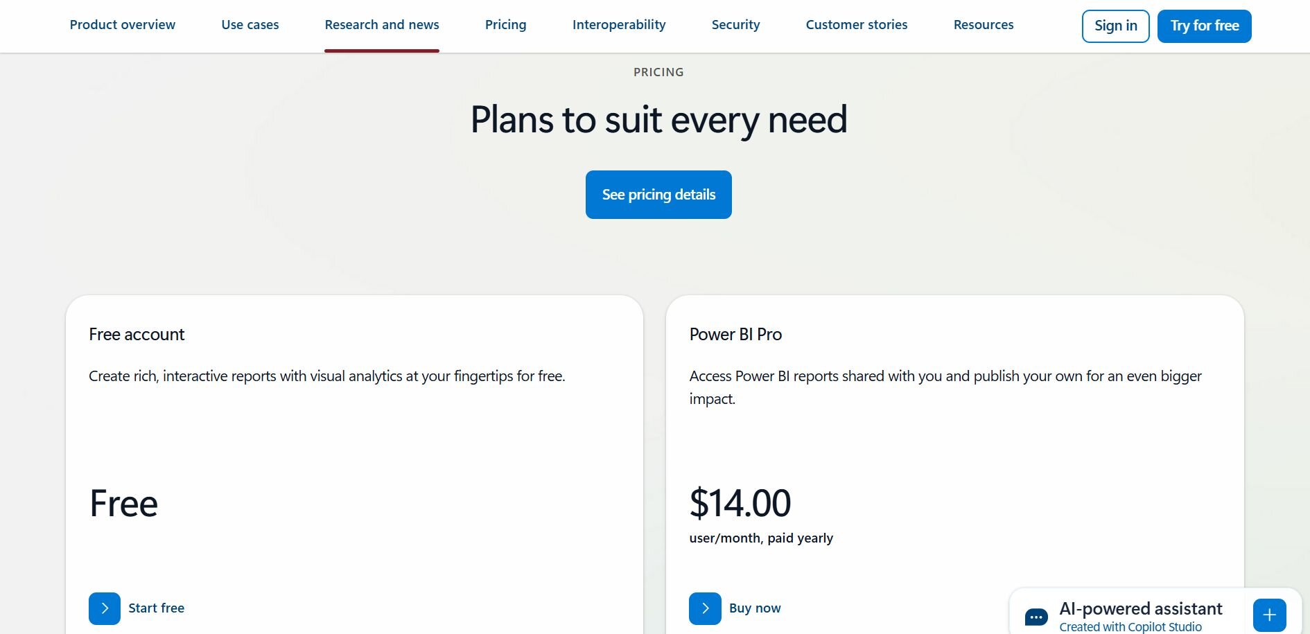What it does: Power BI is Microsoft’s business intelligence platform that builds interactive dashboards and reports from live data sources. It also includes AI features through Copilot and its built-in machine learning tools.