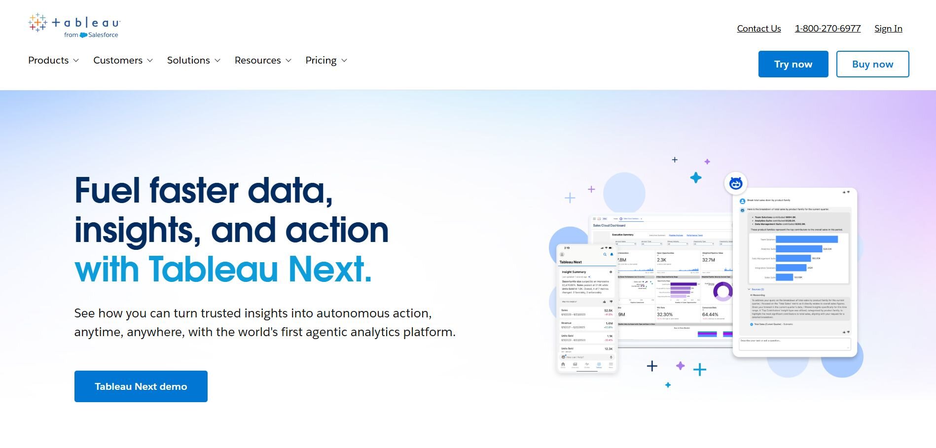 • Key strength: Copilot AI with live dashboard connectionsTableau — Best for business intelligence and visualization