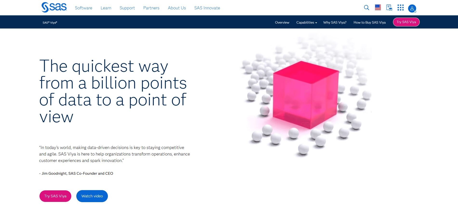 What it does: SAS Viya lets teams prepare data, build predictive models, and share results securely in the cloud. It supports governed projects and connects with code in Python or R.
