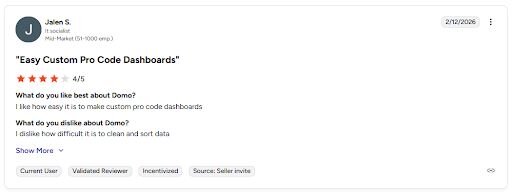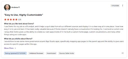 What it does: Domo is a cloud-based business intelligence platform that lets you connect data sources, build dashboards, and set up alerts that trigger when metrics hit specific thresholds.