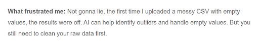 Creates code for data tasks that non-technical users can run or hand off to a developer | Outputs can be inconsistent and may require follow-up prompts to get accurate results |