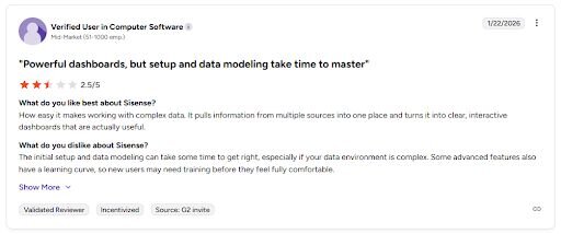 Supports complex multi-source data models without requiring pre-aggregation | Customizing the embedded experience to match your product's design takes significant development effort |