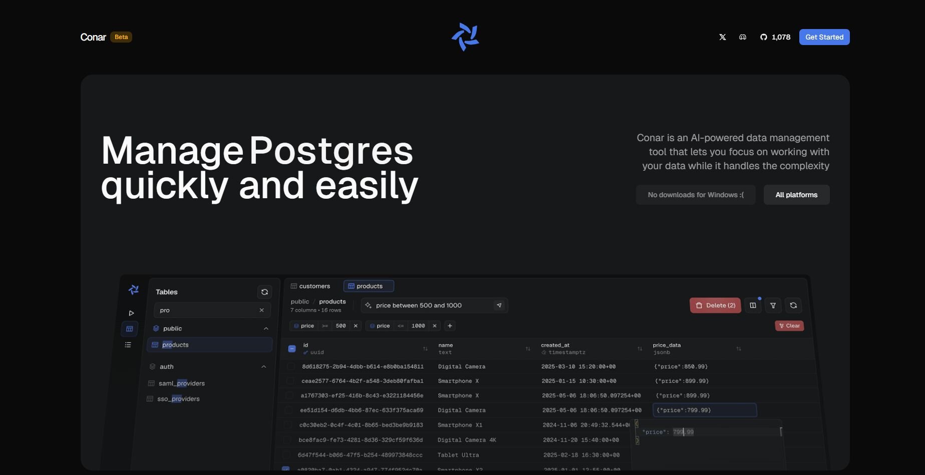 5. Conar: Best for Postgres workflows that need NL filtering