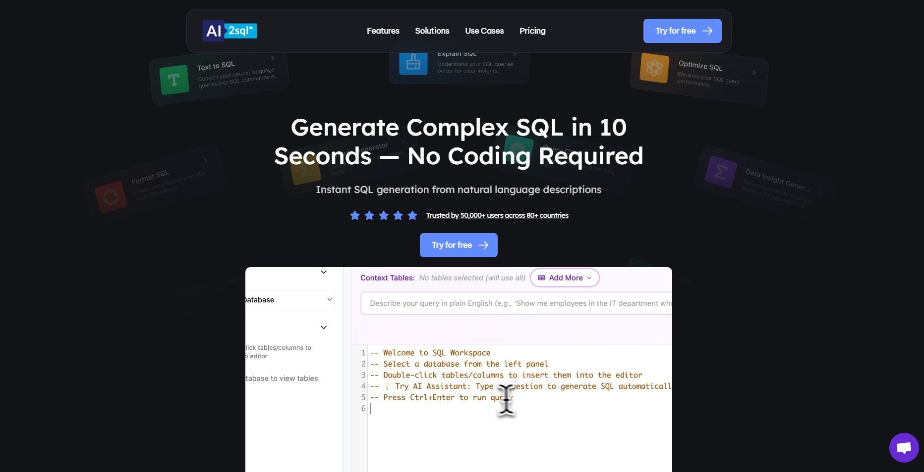 AI2SQL if you need short SQL snippets from plain prompts and plan to paste them into other tools.